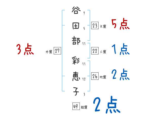 地運![]() | 谷田部彩恵子さんの地運は26画の2つ星!波瀾万丈かも。信頼できる人を大事にしましょう。 個性を表す基礎的な運勢です。性格形成や対人関係、行動力など家庭環境に影響されます。主に誕生してから20歳くらいまでの若年期の運勢を表します。 |