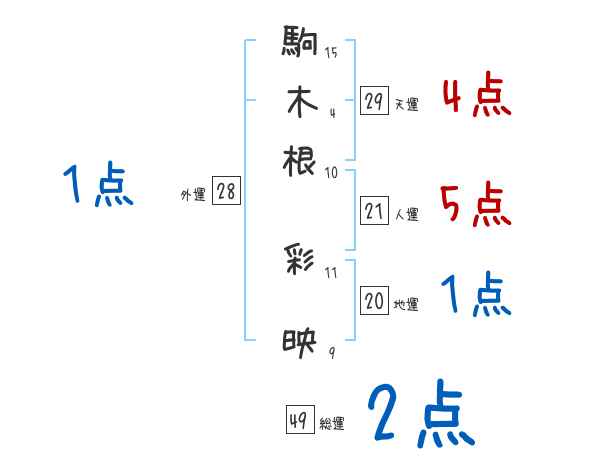 外運![]() | 駒木根彩映さんの外運は28画の1つ星!家庭環境に注意。スポーツで活躍できる能力があるかも。 生活面を象徴する運勢です。外部から受ける影響力を表し、結婚運、家庭運や職場、環境への順応性を表します。 |