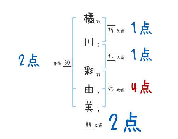 総運![]() | 橘川彩由美さんの総運は44画の2つ星!誠実で慎重な性格。物事を考えすぎないように注意しましょう。 あなたの人生を表す1番重要な運勢です。生涯を通じて影響する総合運となり、主に50歳以降の晩年期に影響を及ぼします。 |