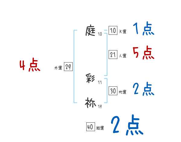 人運![]() | 庭彩祢さんの人運は21画の5つ星!統率力がある。独立し成功する。名誉を手に入れる。 性格や才能などを表す2番目に重要な運勢です。人間関係や協調性、社会的な成功に影響します。主に20歳から50歳ぐらいまでの中年期の運勢を表します。 |