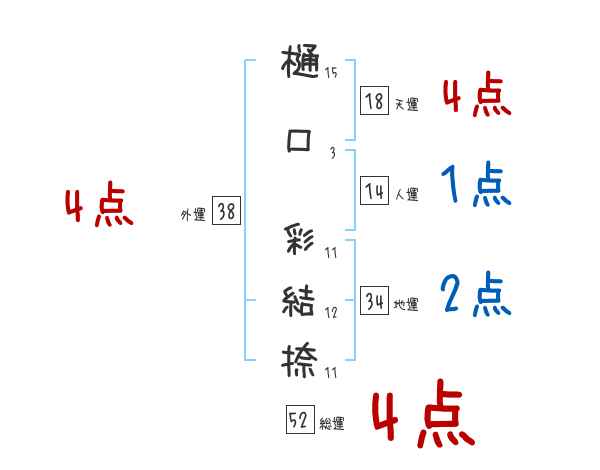 外運![]() | 樋口彩結捺さんの外運は38画の4つ星!温厚な性格で技術的な才能を発揮する。職人的な仕事に向いている。 生活面を象徴する運勢です。外部から受ける影響力を表し、結婚運、家庭運や職場、環境への順応性を表します。 |