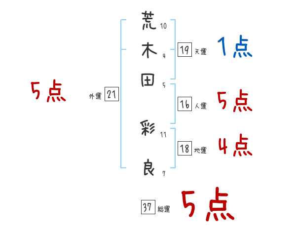 総運![]() | 荒木田彩良さんの総運は37画の5つ星!努力家で順応性に優れる。現実的な考え方ができ忠実に物事をこなす。 あなたの人生を表す1番重要な運勢です。生涯を通じて影響する総合運となり、主に50歳以降の晩年期に影響を及ぼします。 |