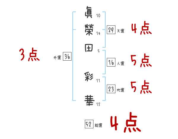 天運![]() | 眞榮田彩華さんの天運は29画の4つ星!完全主義で才能がある。厳格な心の持ち主。 家系が持つ宿命的な運勢を表します。祖先から受け継いだ苗字ですので自分の力が及びません。家柄を象徴します。 |