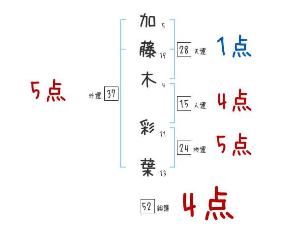 天運![]() | 加藤木彩葉さんの天運は28画の1つ星!家庭環境に注意。スポーツで活躍できる能力があるかも。 家系が持つ宿命的な運勢を表します。祖先から受け継いだ苗字ですので自分の力が及びません。家柄を象徴します。 |