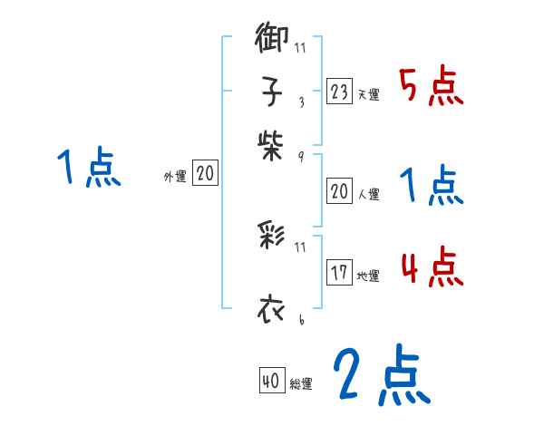 天運![]() | 御子柴彩衣さんの天運は23画の5つ星!想像力に優れ活力がある。一代で成功し名誉を手に入れる。 家系が持つ宿命的な運勢を表します。祖先から受け継いだ苗字ですので自分の力が及びません。家柄を象徴します。 |