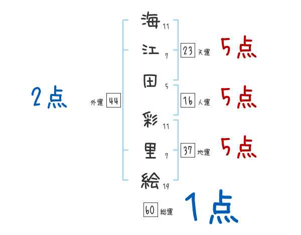 人運![]() | 海江田彩里絵さんの人運は16画の5つ星!人望が厚く大きく発展する。逆転成功が見える。 性格や才能などを表す2番目に重要な運勢です。人間関係や協調性、社会的な成功に影響します。主に20歳から50歳ぐらいまでの中年期の運勢を表します。 |