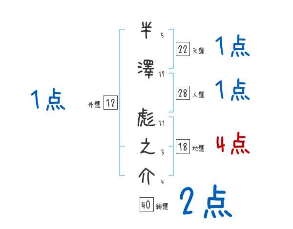 天運![]() | 半澤彪之介さんの天運は22画の1つ星!努力することが苦手ないっぽう手先が器用。芸術性にも優れる。 家系が持つ宿命的な運勢を表します。祖先から受け継いだ苗字ですので自分の力が及びません。家柄を象徴します。 |