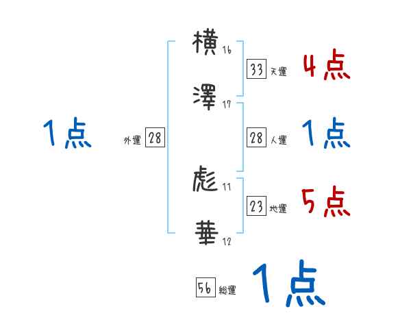 外運![]() | 横澤彪華さんの外運は28画の1つ星!家庭環境に注意。スポーツで活躍できる能力があるかも。 生活面を象徴する運勢です。外部から受ける影響力を表し、結婚運、家庭運や職場、環境への順応性を表します。 |