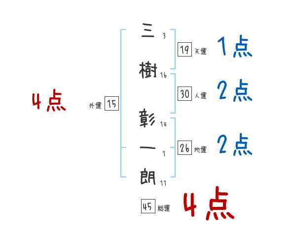 天運![]()  | 三樹彰一朗さんの天運は19画の1つ星!優れた才能を持ちますが、協調性が足りないことも。周りの人と協力する事を意識しましょう。 家系が持つ宿命的な運勢を表します。祖先から受け継いだ苗字ですので自分の力が及びません。家柄を象徴します。 |