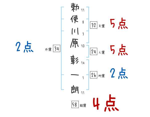 天運![]() | 勅使川原彰一朗さんの天運は32画の5つ星!柔軟性があり成功する。チャンスが多く金運が良い。 家系が持つ宿命的な運勢を表します。祖先から受け継いだ苗字ですので自分の力が及びません。家柄を象徴します。 |