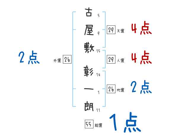 天運![]() | 古屋敷彰一朗さんの天運は29画の4つ星!完全主義で才能がある。厳格な心の持ち主。 家系が持つ宿命的な運勢を表します。祖先から受け継いだ苗字ですので自分の力が及びません。家柄を象徴します。 |