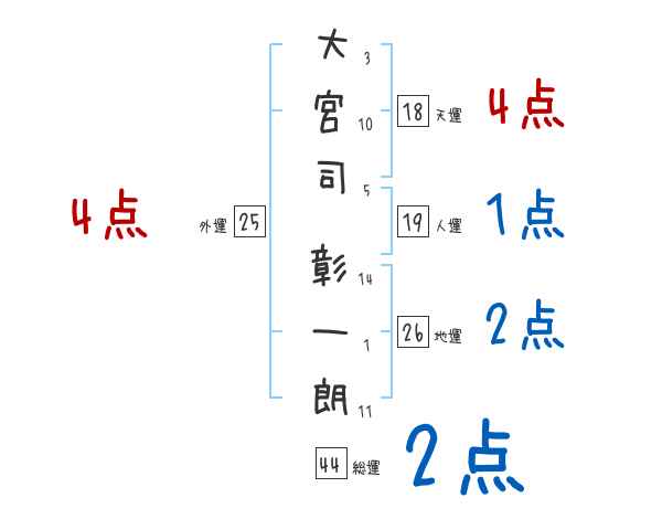 天運![]() | 大宮司彰一朗さんの天運は18画の4つ星!情熱的で剛気。忍耐力があり信頼される。 家系が持つ宿命的な運勢を表します。祖先から受け継いだ苗字ですので自分の力が及びません。家柄を象徴します。 |