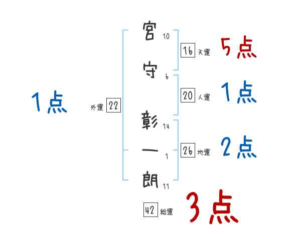 外運![]() | 宮守彰一朗さんの外運は22画の1つ星!努力することが苦手ないっぽう手先が器用。芸術性にも優れる。 生活面を象徴する運勢です。外部から受ける影響力を表し、結婚運、家庭運や職場、環境への順応性を表します。 |
