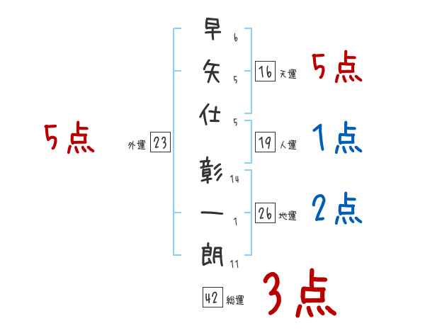 天運![]() | 早矢仕彰一朗さんの天運は16画の5つ星!人望が厚く大きく発展する。逆転成功が見える。 家系が持つ宿命的な運勢を表します。祖先から受け継いだ苗字ですので自分の力が及びません。家柄を象徴します。 |