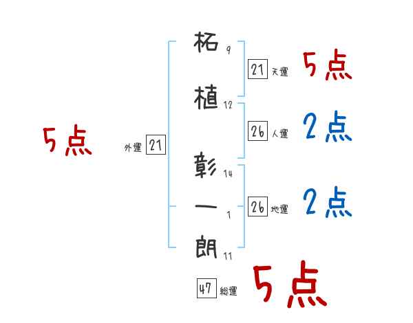 天運![]() | 柘植彰一朗さんの天運は21画の5つ星!統率力がある。独立し成功する。名誉を手に入れる。 家系が持つ宿命的な運勢を表します。祖先から受け継いだ苗字ですので自分の力が及びません。家柄を象徴します。 |