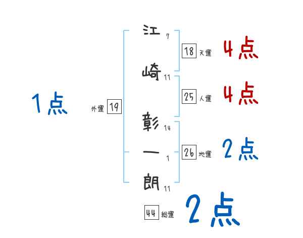 天運![]() | 江崎彰一朗さんの天運は18画の4つ星!情熱的で剛気。忍耐力があり信頼される。 家系が持つ宿命的な運勢を表します。祖先から受け継いだ苗字ですので自分の力が及びません。家柄を象徴します。 |