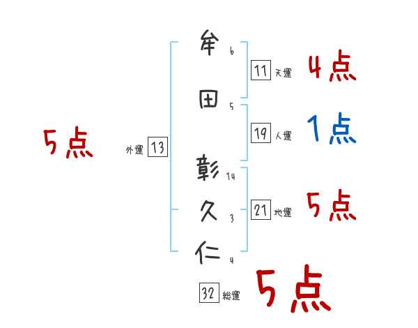 | 天運  | 牟田彰久仁さんの天運は11画の4つ星!着実に富や地位を得る幸運な人生。家系が持つ宿命的な運勢を表します。祖先から受け継いだ苗字ですので自分の力が及びません。家柄を象徴します。 |