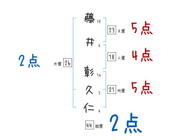 | 天運  | 藤井彰久仁さんの天運は23画の5つ星!想像力に優れ活力がある。一代で成功し名誉を手に入れる。家系が持つ宿命的な運勢を表します。祖先から受け継いだ苗字ですので自分の力が及びません。家柄を象徴します。 |