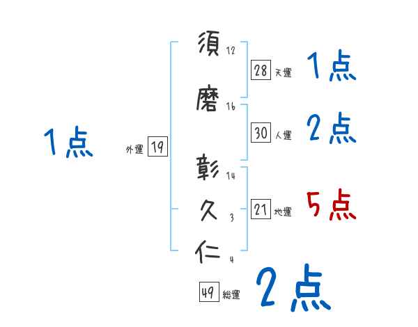 天運![]() | 須磨彰久仁さんの天運は28画の1つ星!家庭環境に注意。スポーツで活躍できる能力があるかも。 家系が持つ宿命的な運勢を表します。祖先から受け継いだ苗字ですので自分の力が及びません。家柄を象徴します。 |