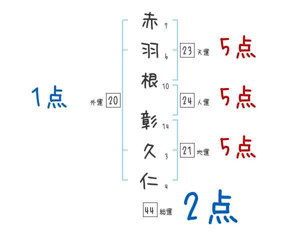 天運![]() | 赤羽根彰久仁さんの天運は23画の5つ星!想像力に優れ活力がある。一代で成功し名誉を手に入れる。 家系が持つ宿命的な運勢を表します。祖先から受け継いだ苗字ですので自分の力が及びません。家柄を象徴します。 |