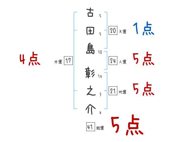外運![]() | 古田島彰之介さんの外運は17画の4つ星!積極的な行動力。地位を気づき財産を手に入れる。純粋な心と直感力。 生活面を象徴する運勢です。外部から受ける影響力を表し、結婚運、家庭運や職場、環境への順応性を表します。 |