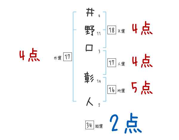 外運![]() | 井野口彰人さんの外運は17画の4つ星!積極的な行動力。地位を気づき財産を手に入れる。純粋な心と直感力。 生活面を象徴する運勢です。外部から受ける影響力を表し、結婚運、家庭運や職場、環境への順応性を表します。 |
