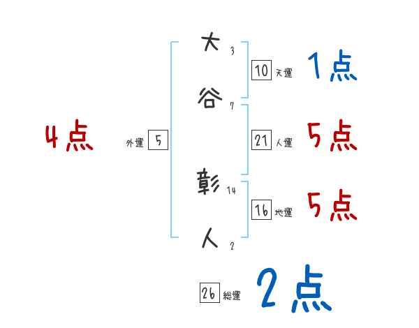 総運![]() | 大谷彰人さんの総運は26画の2つ星!波瀾万丈かも。信頼できる人を大事にしましょう。 あなたの人生を表す1番重要な運勢です。生涯を通じて影響する総合運となり、主に50歳以降の晩年期に影響を及ぼします。 |