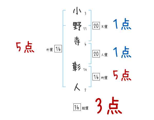 外運![]() | 小野寺彰人さんの外運は16画の5つ星!人望が厚く大きく発展する。逆転成功が見える。 生活面を象徴する運勢です。外部から受ける影響力を表し、結婚運、家庭運や職場、環境への順応性を表します。 |
