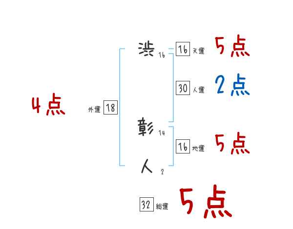 天運![]() | 渋彰人さんの天運は16画の5つ星!人望が厚く大きく発展する。逆転成功が見える。 家系が持つ宿命的な運勢を表します。祖先から受け継いだ苗字ですので自分の力が及びません。家柄を象徴します。 |