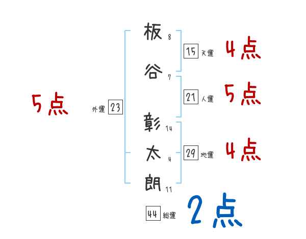 総運![]() | 板谷彰太朗さんの総運は44画の2つ星!誠実で慎重な性格。物事を考えすぎないように注意しましょう。 あなたの人生を表す1番重要な運勢です。生涯を通じて影響する総合運となり、主に50歳以降の晩年期に影響を及ぼします。 |