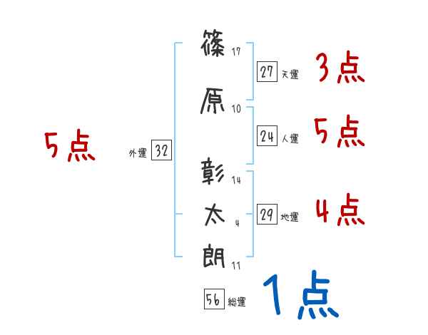 外運![]() | 篠原彰太朗さんの外運は32画の5つ星!柔軟性があり成功する。チャンスが多く金運が良い。 生活面を象徴する運勢です。外部から受ける影響力を表し、結婚運、家庭運や職場、環境への順応性を表します。 |
