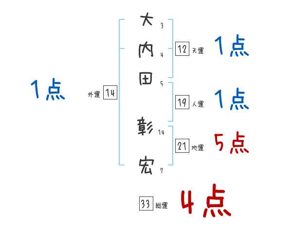 外運![]() | 大内田彰宏さんの外運は14画の1つ星!人に対して優しいがストレスを溜め込みがち。人間関係のトラブルを避けるよう気をつけましょう。 生活面を象徴する運勢です。外部から受ける影響力を表し、結婚運、家庭運や職場、環境への順応性を表します。 |