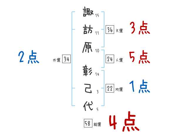 人運![]() | 諏訪原彰己代さんの人運は24画の5つ星!家庭運が良く順調な人生。金運にも恵まれる。 性格や才能などを表す2番目に重要な運勢です。人間関係や協調性、社会的な成功に影響します。主に20歳から50歳ぐらいまでの中年期の運勢を表します。 |