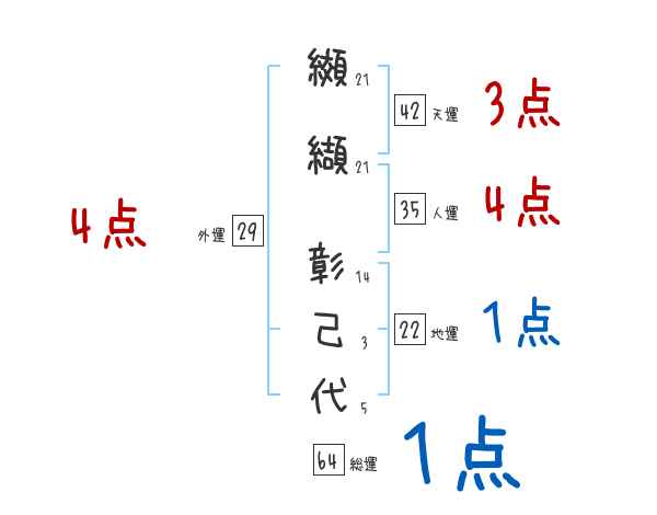 天運![]() | 纐纈彰己代さんの天運は42画の3つ星!病気に注意。多芸であるが消極的でおとなしい。 家系が持つ宿命的な運勢を表します。祖先から受け継いだ苗字ですので自分の力が及びません。家柄を象徴します。 |