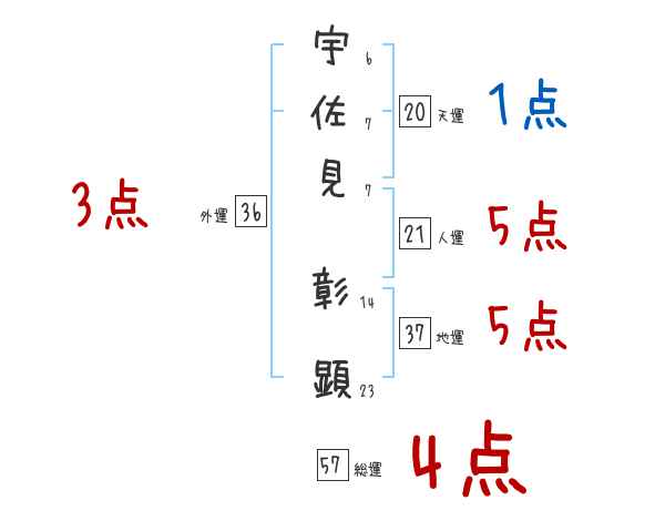 外運![]() | 宇佐見彰顕さんの外運は36画の3つ星!先見性が豊かです。多少神経質で苦労することも。 生活面を象徴する運勢です。外部から受ける影響力を表し、結婚運、家庭運や職場、環境への順応性を表します。 |