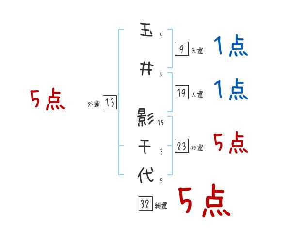 総運![]() | 玉井影千代さんの総運は32画の5つ星!柔軟性があり成功する。チャンスが多く金運が良い。 あなたの人生を表す1番重要な運勢です。生涯を通じて影響する総合運となり、主に50歳以降の晩年期に影響を及ぼします。 |