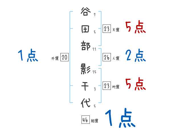 地運![]() | 谷田部影千代さんの地運は23画の5つ星!想像力に優れ活力がある。一代で成功し名誉を手に入れる。 個性を表す基礎的な運勢です。性格形成や対人関係、行動力など家庭環境に影響されます。主に誕生してから20歳くらいまでの若年期の運勢を表します。 |