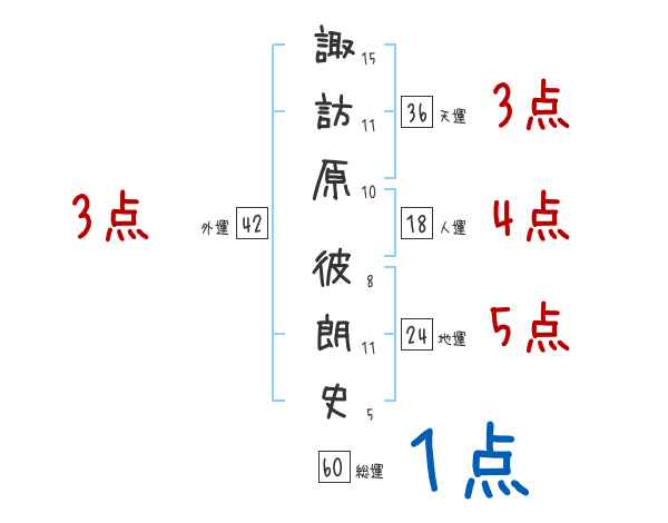 天運![]() | 諏訪原彼朗史さんの天運は36画の3つ星!先見性が豊かです。多少神経質で苦労することも。 家系が持つ宿命的な運勢を表します。祖先から受け継いだ苗字ですので自分の力が及びません。家柄を象徴します。 |