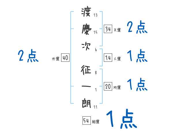 天運![]() | 渡慶次征一朗さんの天運は34画の2つ星!独創性に優れるが、自尊心が強く災難に注意しましょう。 家系が持つ宿命的な運勢を表します。祖先から受け継いだ苗字ですので自分の力が及びません。家柄を象徴します。 |