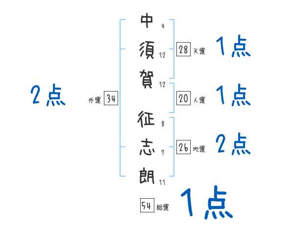 天運![]() | 中須賀征志朗さんの天運は28画の1つ星!家庭環境に注意。スポーツで活躍できる能力があるかも。 家系が持つ宿命的な運勢を表します。祖先から受け継いだ苗字ですので自分の力が及びません。家柄を象徴します。 |