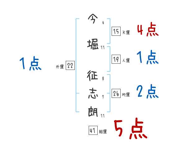 外運![]() | 今堀征志朗さんの外運は22画の1つ星!努力することが苦手ないっぽう手先が器用。芸術性にも優れる。 生活面を象徴する運勢です。外部から受ける影響力を表し、結婚運、家庭運や職場、環境への順応性を表します。 |