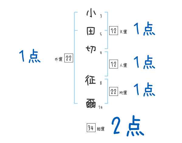 総運![]() | 小田切征爾さんの総運は34画の2つ星!独創性に優れるが、自尊心が強く災難に注意しましょう。 あなたの人生を表す1番重要な運勢です。生涯を通じて影響する総合運となり、主に50歳以降の晩年期に影響を及ぼします。 |