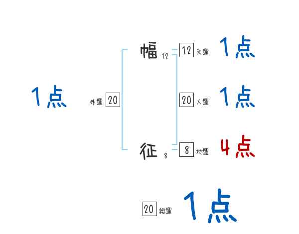 天運![]() | 幅征さんの天運は12画の1つ星!簡単な失敗で諦めてしまいやすいかも。着実に行動すると良いでしょう。 家系が持つ宿命的な運勢を表します。祖先から受け継いだ苗字ですので自分の力が及びません。家柄を象徴します。 |