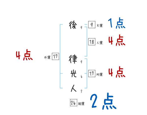 天運![]() | 後律光人さんの天運は9画の1つ星!消極的で才能を発揮することが苦手なことも。周りの意見に耳を傾けましょう。 家系が持つ宿命的な運勢を表します。祖先から受け継いだ苗字ですので自分の力が及びません。家柄を象徴します。 |
