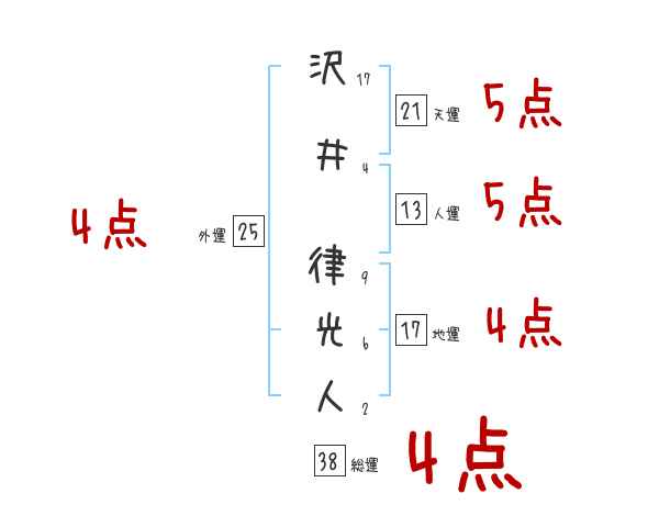地運![]() | 沢井律光人さんの地運は17画の4つ星!積極的な行動力。地位を気づき財産を手に入れる。純粋な心と直感力。 個性を表す基礎的な運勢です。性格形成や対人関係、行動力など家庭環境に影響されます。主に誕生してから20歳くらいまでの若年期の運勢を表します。 |