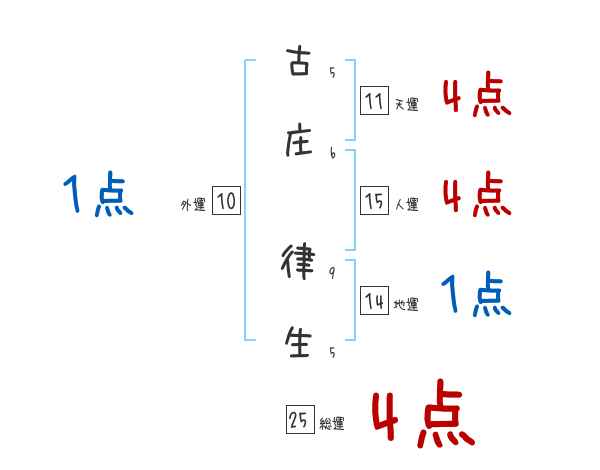 天運![]() | 古庄律生さんの天運は11画の4つ星!着実に富や地位を得る幸運な人生。 家系が持つ宿命的な運勢を表します。祖先から受け継いだ苗字ですので自分の力が及びません。家柄を象徴します。 |