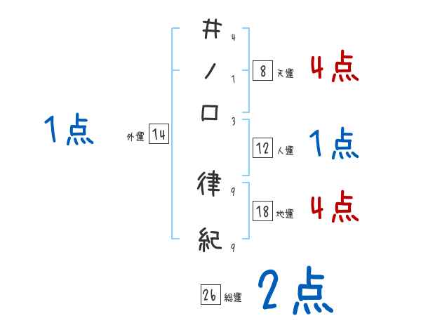 外運![]() | 井ノ口律紀さんの外運は14画の1つ星!人に対して優しいがストレスを溜め込みがち。人間関係のトラブルを避けるよう気をつけましょう。 生活面を象徴する運勢です。外部から受ける影響力を表し、結婚運、家庭運や職場、環境への順応性を表します。 |