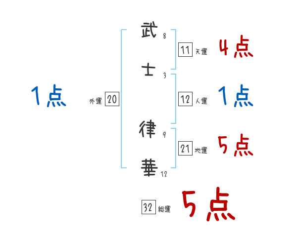 天運![]() | 武士律華さんの天運は11画の4つ星!着実に富や地位を得る幸運な人生。 家系が持つ宿命的な運勢を表します。祖先から受け継いだ苗字ですので自分の力が及びません。家柄を象徴します。 |