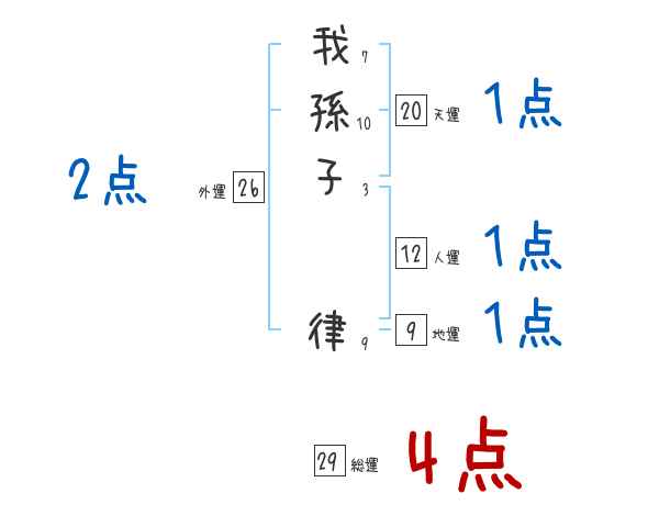 外運![]() | 我孫子律さんの外運は26画の2つ星!波瀾万丈かも。信頼できる人を大事にしましょう。 生活面を象徴する運勢です。外部から受ける影響力を表し、結婚運、家庭運や職場、環境への順応性を表します。 |