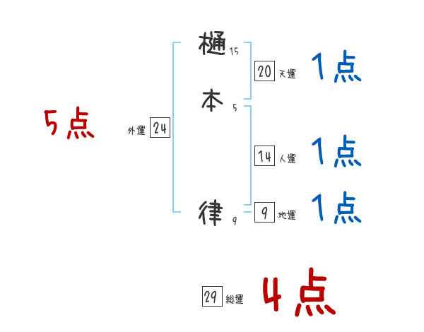 外運![]() | 樋本律さんの外運は24画の5つ星!家庭運が良く順調な人生。金運にも恵まれる。 生活面を象徴する運勢です。外部から受ける影響力を表し、結婚運、家庭運や職場、環境への順応性を表します。 |